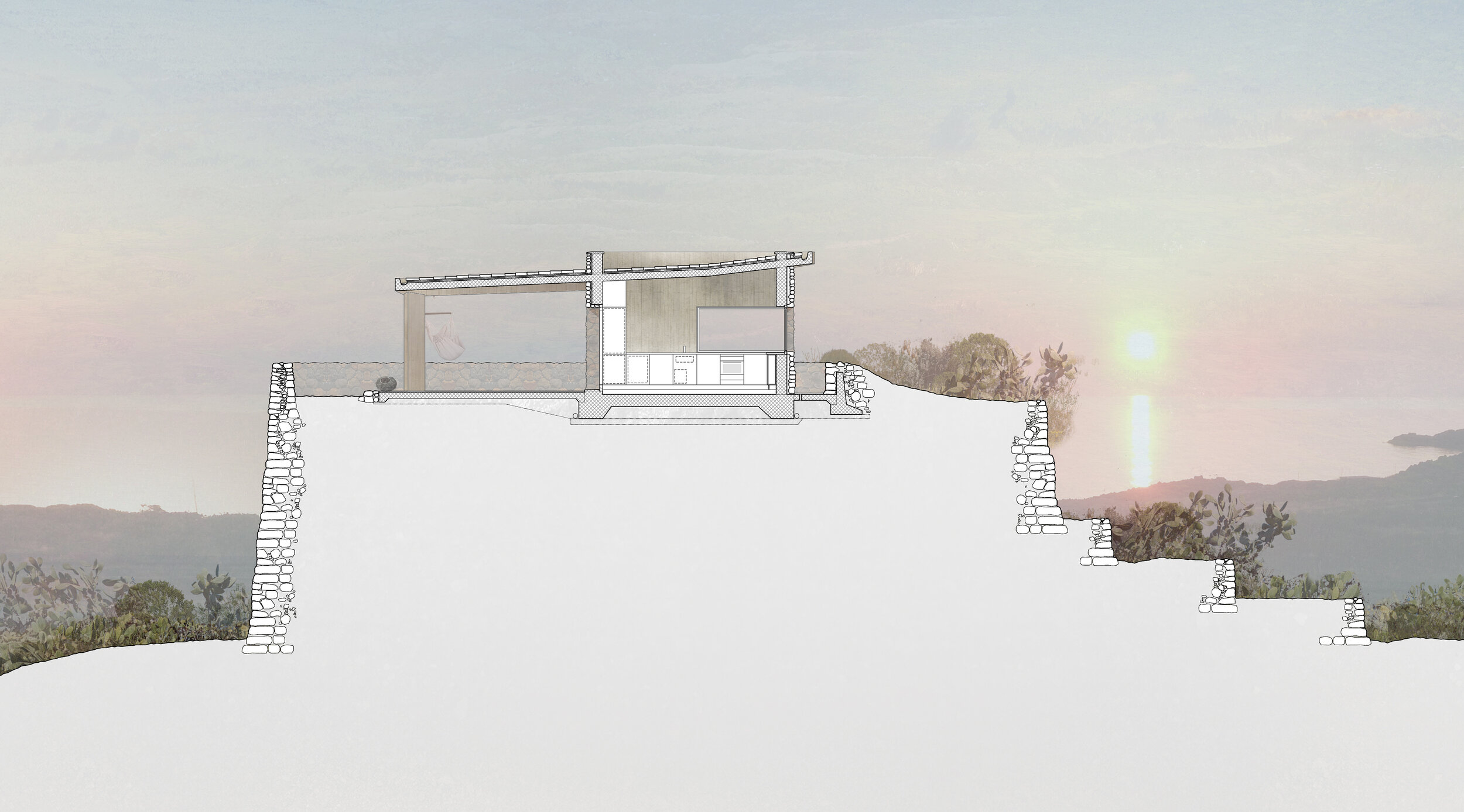 Posizionata sul promontorio roccioso che domina la proprietà, gode di una panoramica vista sull'intera contrada. Gli elementi architettonici attorno ai quali si concentra il progetto sono l’impiego della pietra locale, il principio del terrazzamento e l’utilizzo della pergola.